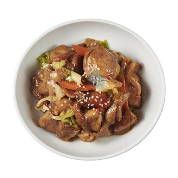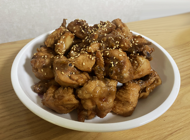 5. 익힌 칠리소스 닭고기볶음을 그릇에 담고, 참기름과 후추로 마무리해줍니다.