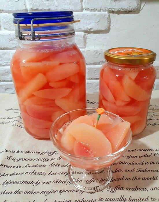 복숭아 통조림을 만들기 위해 필요한 재료는 다음과 같습니다: