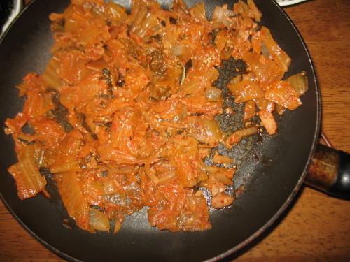 준비한 김치를 팬에 넣고 함께 볶아줍니다. 김치의 양에 따라 볶는 시간을 조절하며, 고추장과 간장을 넣고 골고루 섞습니다. 마지막으로 참치를 넣고 중불에서 볶아줍니다.