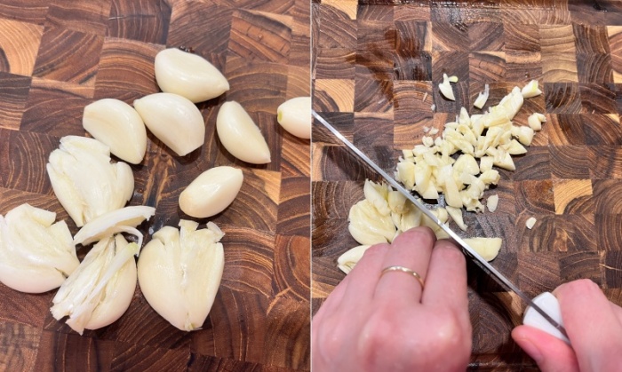 생마늘을 껍질을 벗기고 얇게 슬라이스해 주세요. 너무 얇으면 타기 쉬우므로 1~2mm 두께가 적당합니다.