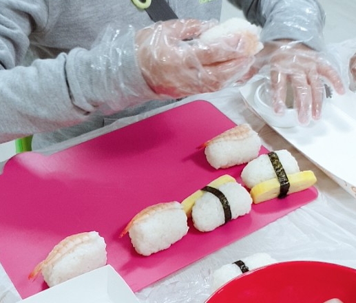 마지막으로 식힌 쌀을 손에 물을 묻힌 후 적당한 양을 덜어내어 원하는 형태로 만듭니다. 위에 원하는 토핑을 얹어주면 완벽한 초밥이 완성됩니다! 🥳