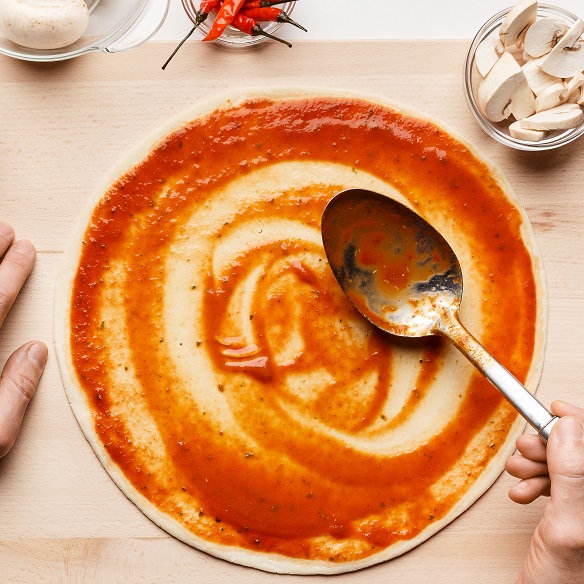 토마토를 끓는 물에 담가 껍질을 벗겨주고, 다듬어서 믹서기에 갈아 만듭니다. 팬에 올리브 오일을 데우고 다진 마늘을 볶아 향을 낸 후 토마토 퓨레를 넣고 끓입니다. 바질 잎과 소금, 후추로 맛을 조절한 뒤 중간 불에서 20분간 끓여줍니다. 이렇게 만든 토마토 소스를 피자 바에 발라줍니다.