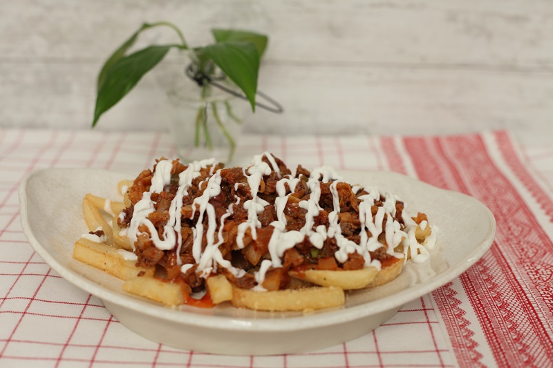 프렌치 프라이 위에 치즈를 녹여서 만들면 더욱 고소한 맛이 느껴집니다. 치즈를 녹인 후에 색다른 향신료를 뿌려보세요.